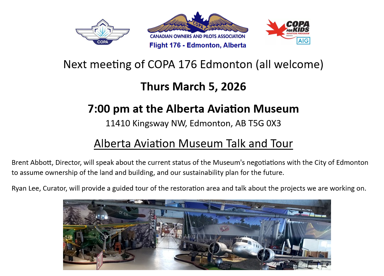 Our meetings are normally held on the first Thursday of each month at the Aviation Museum, 11410 Kingsway NW, Edmonton, AB T5G 0X3.